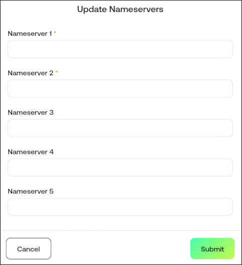 - In the Update Nameservers dialog box, type the nameservers you want to use. You must specify at least two (a primary and a secondary) nameservers: