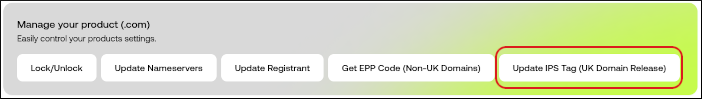 For UK domains, if you want to transfer your domain to another registrar, you must update the IPS (Internet Provider Security) tag for the domain. The IPS tag is an additional security measure that helps prevent unauthorized domain transfers.