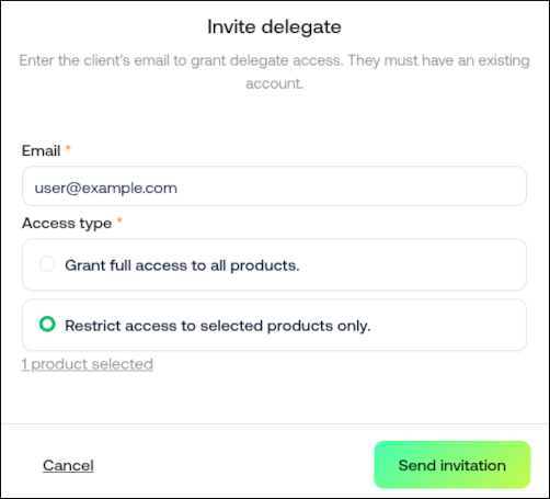 - To add a delegate, click Invite delegate. In the Invite delegate dialog box, type the email address of the person you want to invite, select what type of access you want to grant, and then click Send invitation: