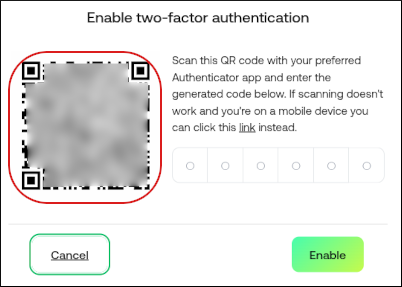 - In the Enable two-factor authentication dialog box, type the six-digit code that appears on your device's authenticator app.