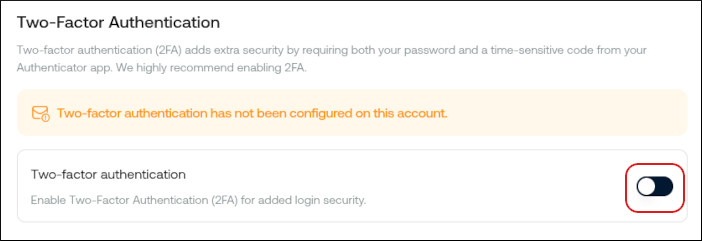 - In the Two-factor authentication section, you can enable two-factor authentication (also known as "2FA"). To do this, click the slider:
