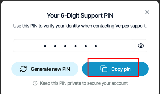- To copy your support PIN to the clipboard so you can quickly paste it into a chat with us, click Copy pin: